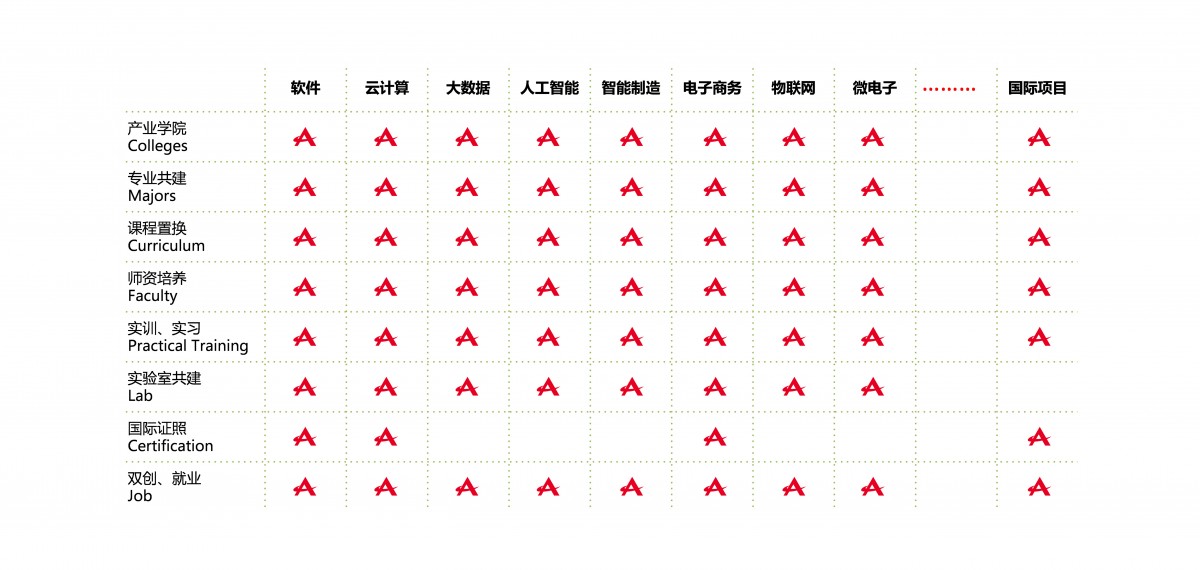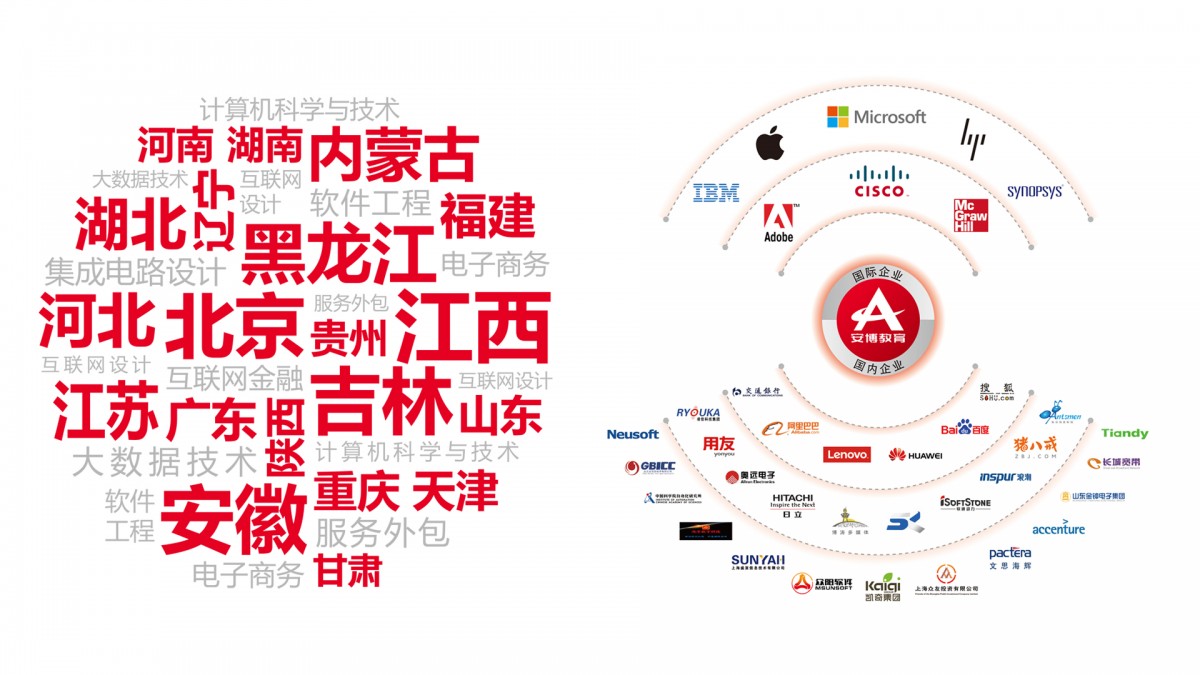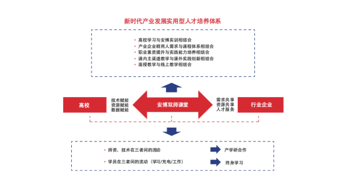 安博应用型互联网创新人才培养体系(简称:安博大学体系)通过构建六大体系(专业课程、创新创业、实训、质量保障、国际化、云服务),培养学生专业素养、职业素养和创业素养,推动高校办学体制与办学机制变革,致力于为应用型大学建设、企业人力资源建设、国家和地区人才战略布局等构建互联网时代的人才公共服务平台。